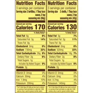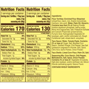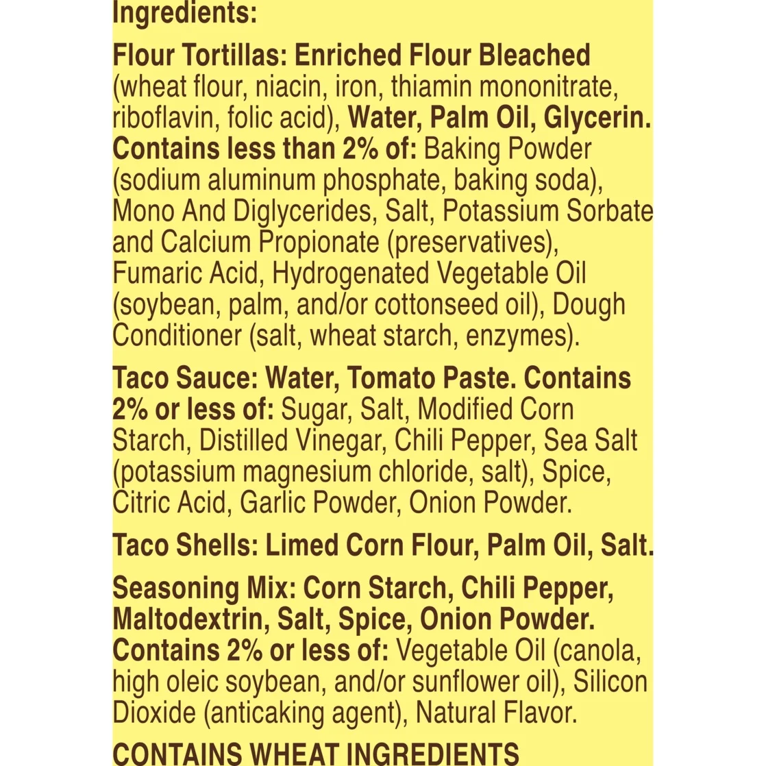 Flour Tortillas: Enriched Flour Bleached (wheat flour, niacin, iron, thiamin mononitrate, riboflavin, folic acid), Water, Palm Oil, Glycerin. Contains less than 2% of: Baking Powder (sodium aluminum phosphate, baking soda), Mono And Diglycerides, Salt, Potassium Sorbate and Calcium Propionate (preservatives), Fumaric Acid, Hydrogenated Vegetable Oil (soybean, palm, and/or cottonseed oil), Dough Conditioner (salt, wheat starch, enzymes). Taco Sauce: Water, Tomato Paste. Contains 2% or less of: Sugar, Salt, Modified Corn Starch, Distilled Vinegar, Chili Pepper, Sea Salt (potassium magnesium chloride, salt), Spice, Citric Acid, Garlic Powder, Onion Powder. Taco Shells: Limed Corn Flour, Palm Oil, Salt. Seasoning Mix: Corn Starch, Chili Pepper, Maltodextrin, Salt, Spice, Onion Powder. Contains 2% or less of: Vegetable Oil (canola, high oleic soybean, and/or sunflower oil), Silicon Dioxide (anticaking agent), Natural Flavor.