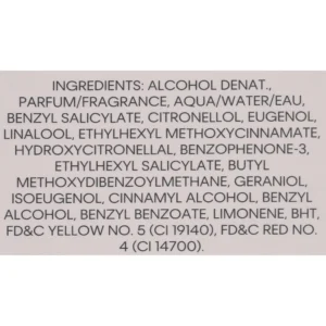 Alcohol Denat., Fragrance (Parfum), Water (Aqua/Eau), Benzyl Salicylate, Butylphenyl Methylpropional, Acrylates/Octylacrylamide Copolymer, Benzophenone-3, Benzyl Alcohol, Benzyl Benzoate, Butyl Methoxydibenzoylmethane, Cinnamyl Alcohol, Citronellol, Ethylhexyl, Methoxycinnamate, Ethylhexyl Salicylate, Eugenol, Geraniol, Hydrolyzed Jojoba Esters, Hydroxycitronellal, Hydroxyisohexyl 3-Cyclohexene Carboxaldehyde, Isoeugenol, Limonene, Linalool, Propylene Glycol, Red 4 (Ci 14700), Yellow 5 (Ci 19140)