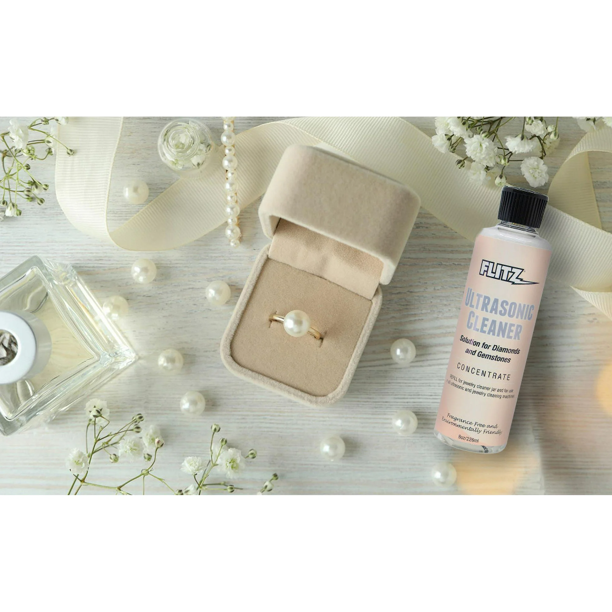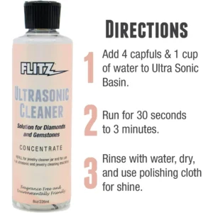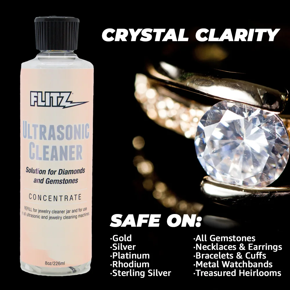 Flitz Ultrasonic Jewelry Cleaner Solution, Jewelry Cleaner Liquid for a Polished Appearance, 8 oz; Flitz Ultrasonic Jewelry Cleaner Solution breathes new life into your jewelry, restoring their natural shine and sparkle. This jewelry cleaner works effectively in ultrasonic machines to lift away stubborn residues like soap, lotion, oils, grease, makeup, and hairspray from rings, earrings, bracelets, and more. Suitable for metals such as gold, silver, and delicate items like pearls, this concentrated solution delivers a professional-quality clean without damage. Its versatile formulation tackles everyday grime, leaving your jewelry with a polished, fingerprint-free finish. Add a capful to water in your ultrasonic cleaner for a transformative shine, making each piece look brand new. Maintain the brilliance of diamonds, revive silver’s luster, and keep earrings and rings vibrant with this sterling silver cleaner, preserving your treasured items for years.