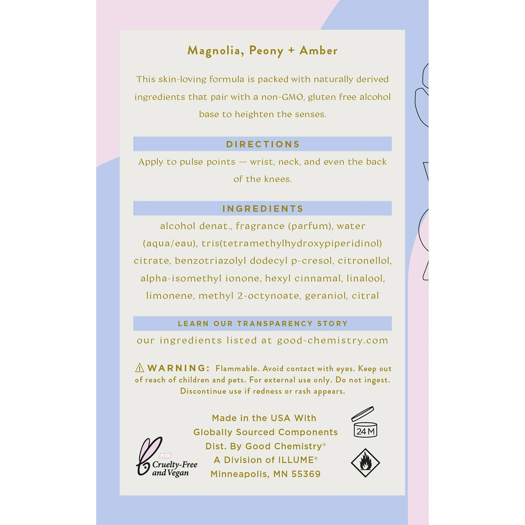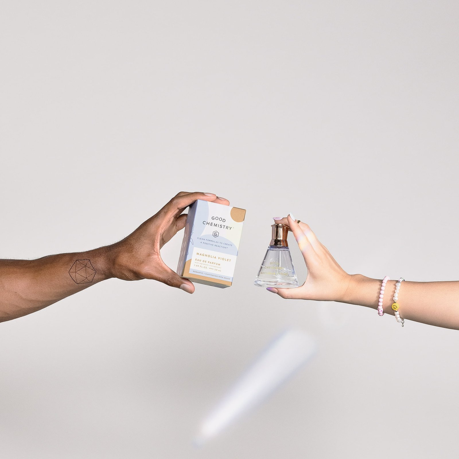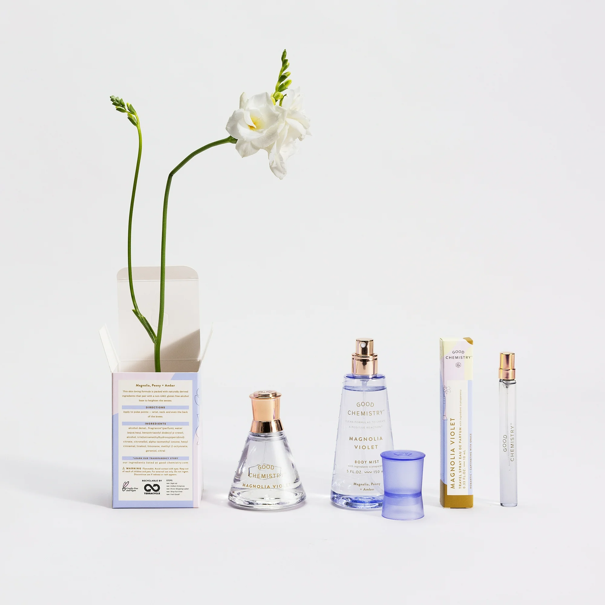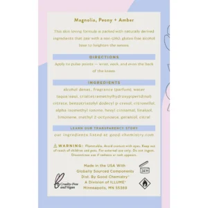 Good Chemistry Magnolia Violet Eau de Parfum Perfume invites you on a unique adventure with its sheer floral aspects and warm undertones. With notes of magnolia, peony, and amber, Magnolia Violet Eau de Parfum perfume spray is romantic and captivating with true elegance. Using the most-concentrated formulation, this perfume is ideal for an all-over spray perfume application and is best for those wanting to announce their presence through fragrance. Apply to your wrists, your neck, and even your hair to refresh no matter where you are. For a more personalized signature scent, use our Eau de Parfum perfume spray as your base and layer with our Body Mist to refresh throughout the day. Our Eau de Parfum is made with essential oils, naturally-derived ingredients, and safe synthetics, and it has a non-GMO, gluten-free alcohol base. It is also cruelty-free, vegan, and made without phthalates, parabens, mineral oil, or propylene glycol. There’s a science to positive vibes, and we’re here for it. With affordable, fun fragrances, cruelty-free formulas, and the know-how to create a positive reaction (from your nose to your toes!), that’s Good Chemistry.
