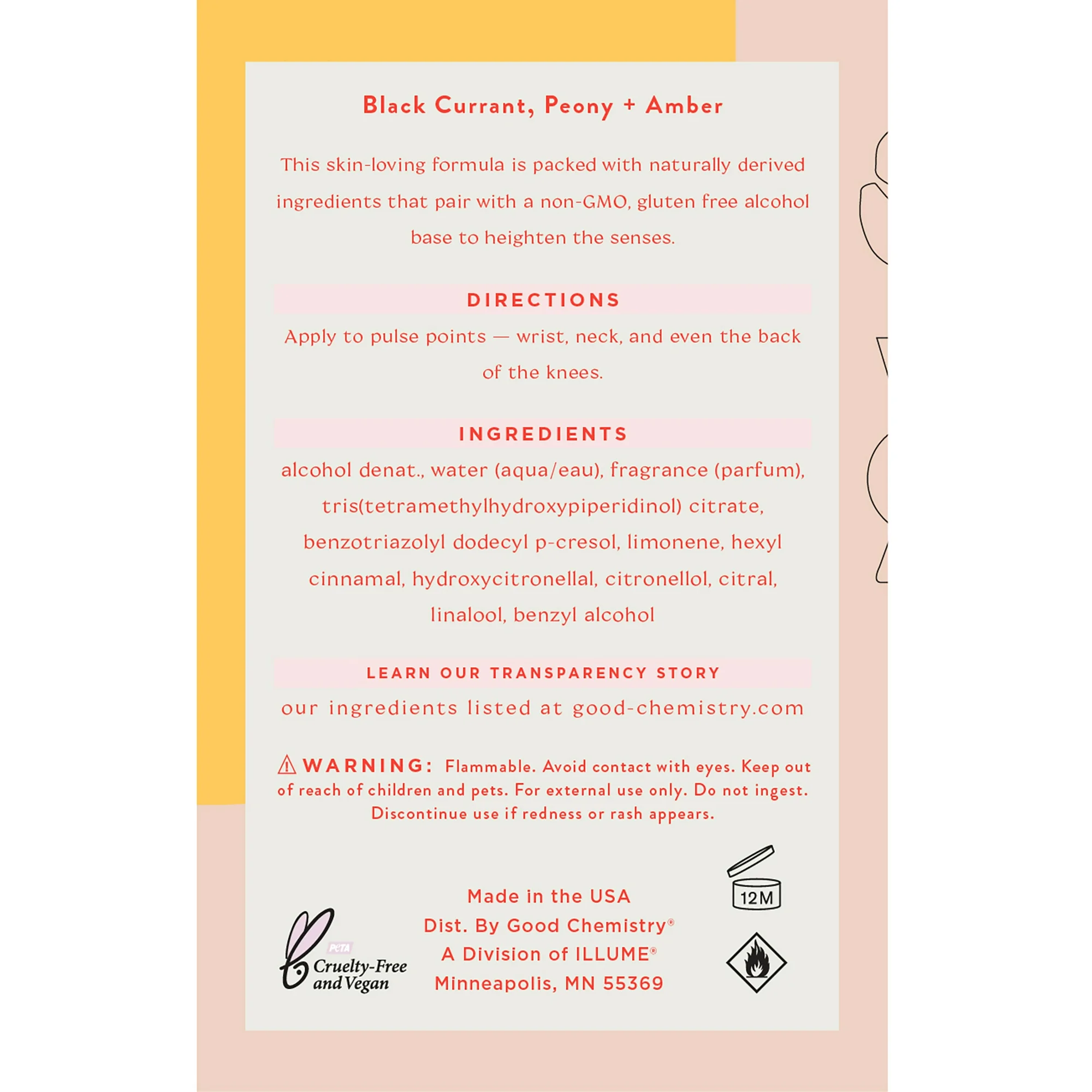 Good Chemistry Queen Bee Eau de Parfum Perfume is a royal celebration of sparkling fruits that unfolds to reveal Queen Bee’s fresh, floral heart. With notes of black currant, peony, and amber, Queen Bee Eau de Parfum perfume spray is vibrant and bold with a touch of sass. Using the most-concentrated formulation, this perfume is ideal for an all-over spray perfume application and is best for those wanting to announce their presence through fragrance. Apply to your wrists, your neck, and even your hair to refresh no matter where you are. For a more personalized signature scent, use our Eau de Parfum perfume spray as your base and layer with our Body Mist to refresh throughout the day. Our Eau de Parfum is made with essential oils, naturally-derived ingredients, and safe synthetics, and it has a non-GMO, gluten-free alcohol base. It is also cruelty-free, vegan, and made without phthalates, parabens, mineral oil, or propylene glycol. There’s a science to positive vibes, and we’re here for it. With affordable, fun fragrances, cruelty-free formulas, and the know-how to create a positive reaction (from your nose to your toes!), that’s Good Chemistry.
