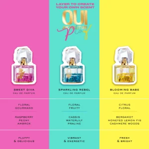 • Layer Sparkling Rebel with Oui Juicy Couture Play Sweet Diva to create a vibrant & delicious scent combination. Or layer Sparkling Rebel with Oui Juicy Couture Play Sweet Diva & Oui Juicy Couture Play Blooming Babe to create a vibrant, delicious & fresh scent combination.
