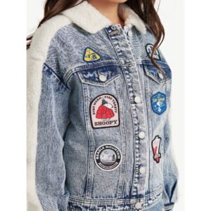 Experience the ultimate style collaboration of the season with the Justice Girls Snoopy Jacket with Patches! This denim jacket, featuring white sherpa along the collar, sleeves, and back, showcases the perfect fusion of comfort and trendiness. Adorned with multiple eye-catching patches and a convenient button closure, it’s the perfect pick for her wardrobe. Pair it effortlessly with any of her favorite Justice bottoms for a complete outfit. Just throw it on when the weather gets a little chilly and watch her receive compliments galore wherever she goes. Let Snoopy X Justice help her express herself with undeniable style every step of the way! Only at Walmart.